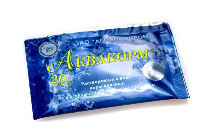 Аквакорм, 20 г - витаминизированный корм для поения пчел. Представляет собой сбалансированный комплекс солей микроэлементов и витаминов.