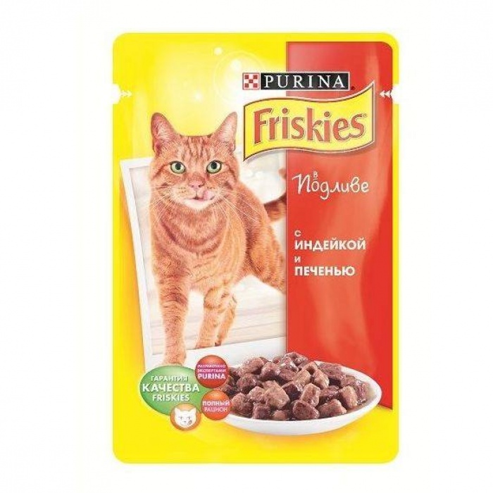 ԿԵՐԵՐ ԿԱՏՈՒՆԵՐԻ > Պահածոյացված եւ փափուկ կերեր > "FRISKIES" для взрослых кошек с индейкой и печенью в подливе 100 г