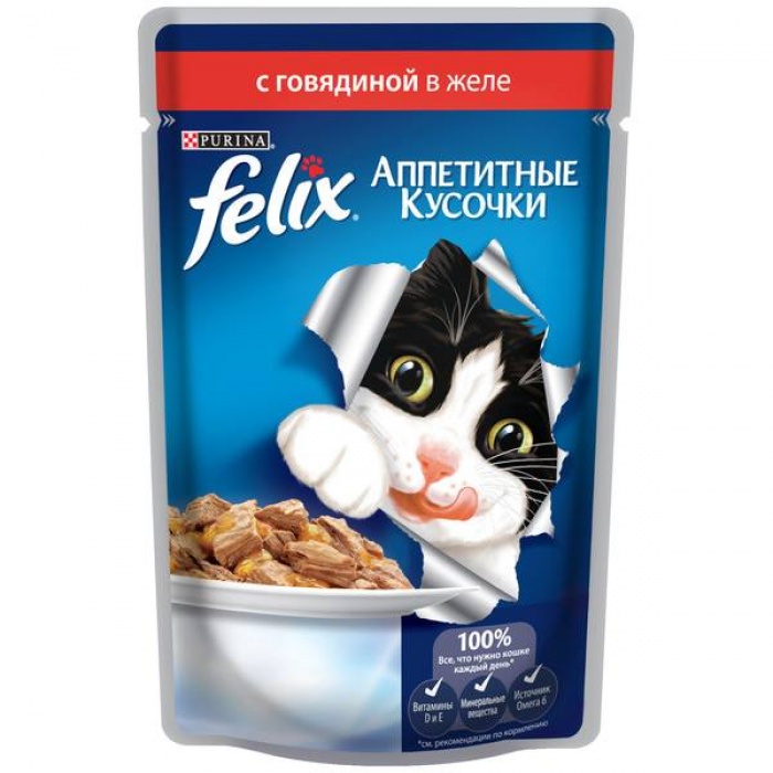 Консервы Felix Аппетитные Кусочки — это совершенно особенный корм для кошек. У него такой аппетитный вид и аромат, словно его приготовили вы сами. Влажный корм для кошек «Феликс Аппетитные Кусочки» создан по специально разработанной рецептуре: нежнейшие кусочки лакомой говядины, покрытые сочным желе. Ваш кот будет готов есть такое угощение хоть каждый день — на завтрак, обед и ужин.