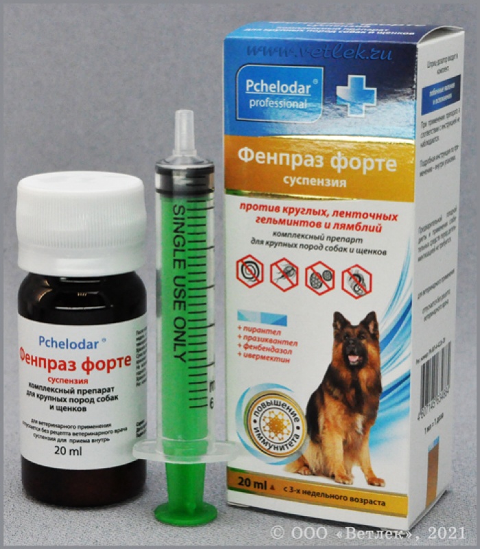 Антигельминтное лекарственное средство (от глистов) в виде суспензии со вкусом мяса для лечения нематодозов и цестодозов собак. В 1 мл суспензии содержится: пирантела памоат – 56 мг, празиквантел – 20 мг, фенбендазол – 6,0 мг, пчелиное маточное молочко – 2,0 мг, вспомогательные компоненты.