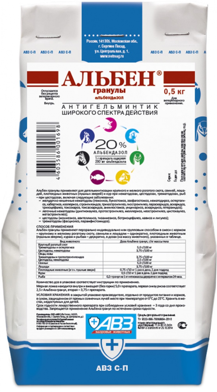 При групповом способе применения, рассчитанную дозу «Альбена гранул» смешивают с концентрированным кормом (из расчета корма на 1 животное): лошадям и крупному рогатом скоту – 0,5–1,0 кг; овцам, козам и свиньям – 150–200 г; птице – 50 г; плотоядным животным – 50–100 г).