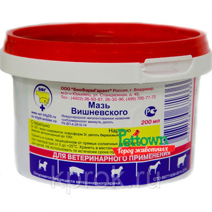 Վիշնևսկու քսուկն օգտագործում են կենդանիների մաշկային հիվանդությունների, պսորիազի բուժման ժամանակ:Ախտահարված հատվածը մշակել օրական1-2 անգամ: Անասնաբուժական դեղատանն առկա են 200մլ./1600դրամ/ և 500 մլ/3500/ տարրաներ:
