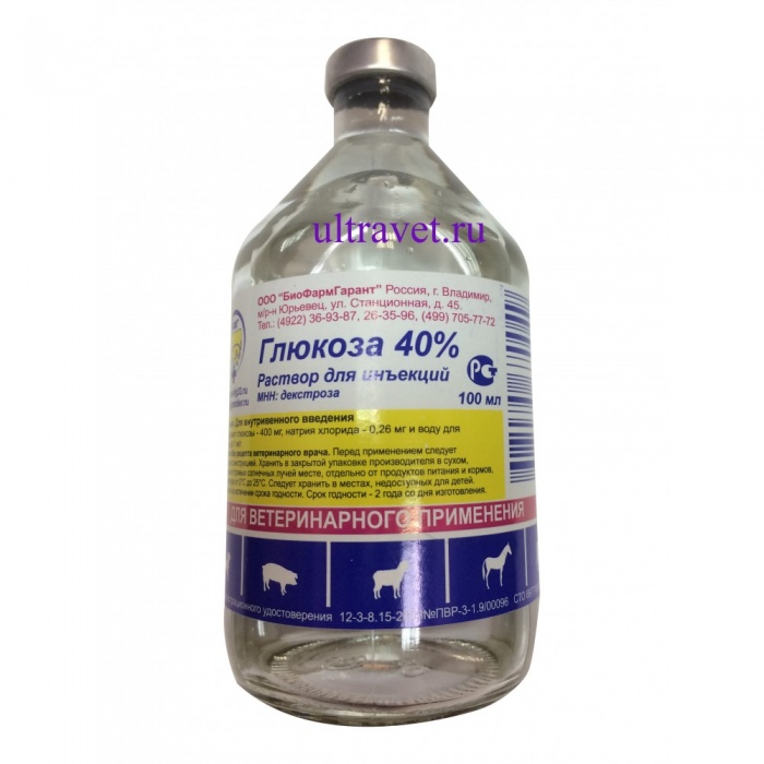Գլյուկոզա40% դասվում է ածխաջրածնային դեղամիջոցների շարքին: Օրգանիզմում նպաստում է թթվային բալանսի վերականգմանը: Ունի հակատոքսիկ ազդեցություն՝ երիկամների և սրտի համար: Կենդանիներին ներարկում են ենթամաշկ՝ կատուներ/5-20մլ/կգ/, շներ/ 5-50մլ/կգ/ ,խոզեր/20-75մլ/կգ/ ,մանր եղջերավոր կենդանիներ/ 10-75 մլ/կգ/, ձիեր/ 75-300մլ/կգ/ և խոշոր եղջերավոր կենդանիներ/75-370մլ/կգ/ դեղաչափքվ: Անասնաբուժական դեղատանն առկա են 200մլ/600դրամ/ և 400մլ/ 1000 դրամ/ տարողությամբ տարրաներով գլյուկոզա40%: