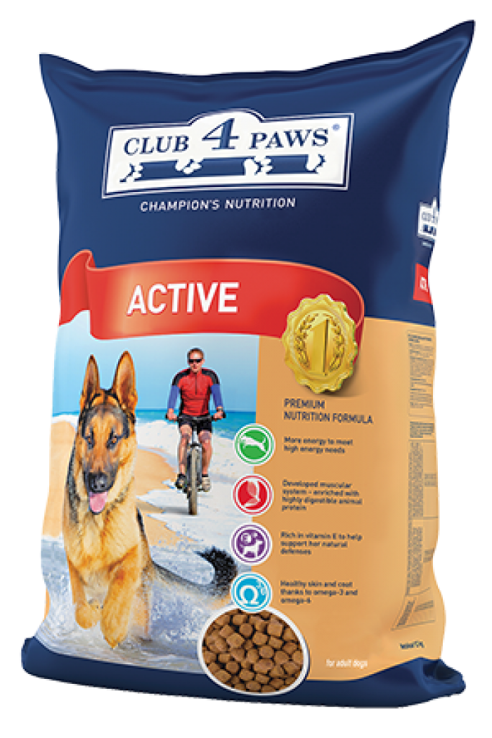 "CLUB 4 PAWS" сухой корм для активных собак – это высококачественное полноценное питание для взрослых собак активных пород, а также для собак в период беременности и лактации.